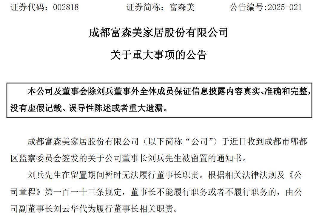 富森美表示,刘兵在留置期间暂时无法履行董事长职责。根据相关法律法规及《公司章程》第一百一十三条规定,董事长不能履行职务或者不履行职务的,由公司副董事长刘云华代为履行董事长相关职责。
