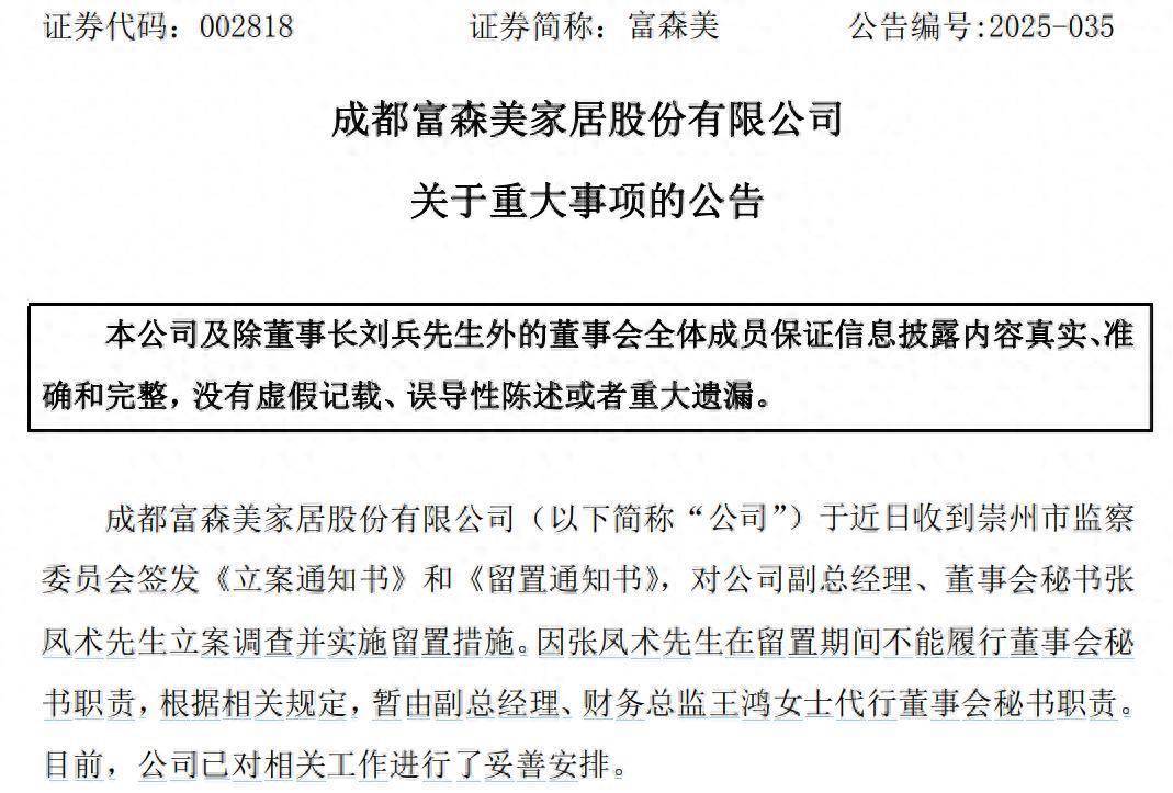 7月24日晚间,富森美公告称,公司近日收到成都市郫都区监察委员会签发的关于公司董事长刘兵被留置的通知书。